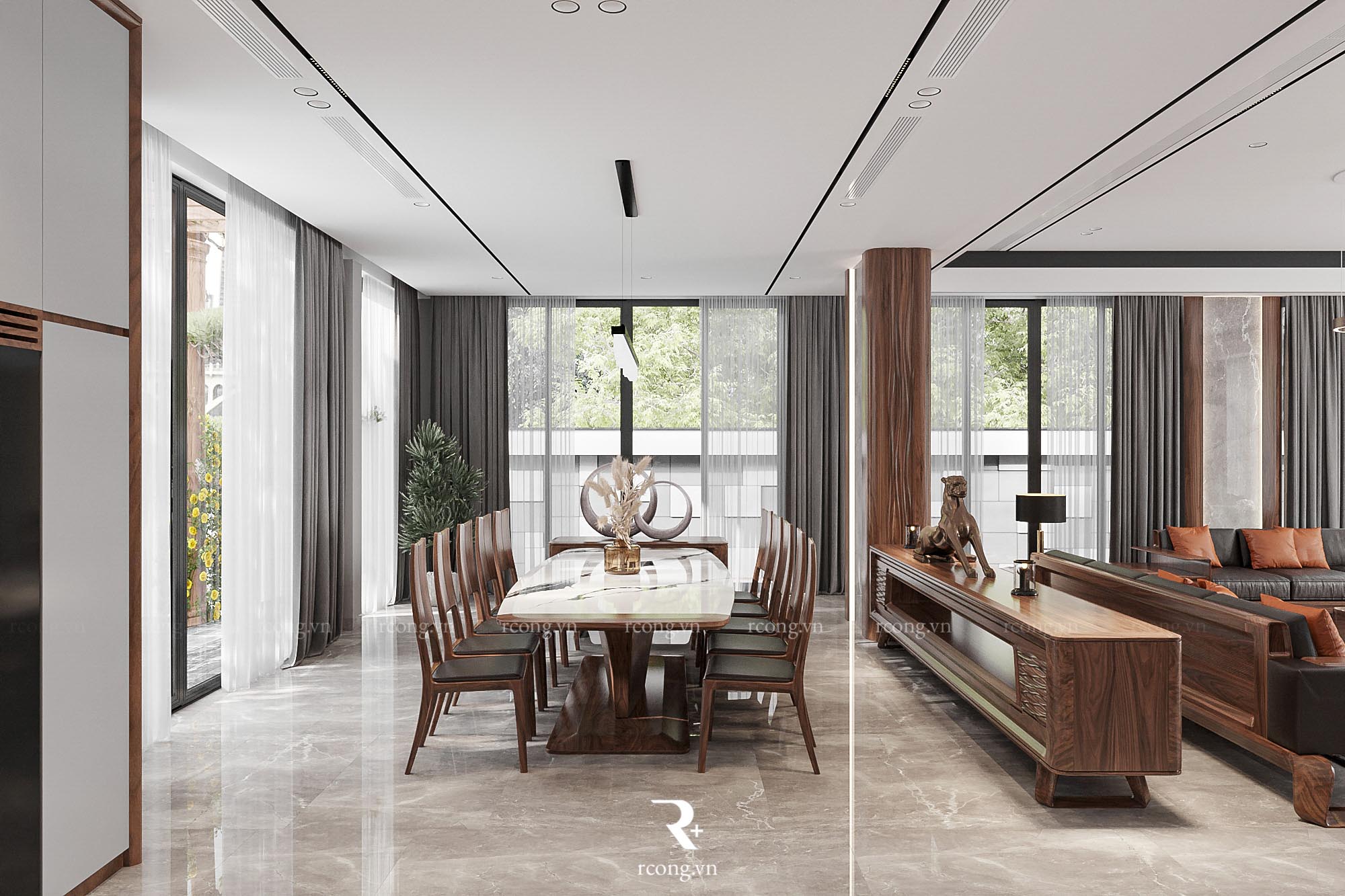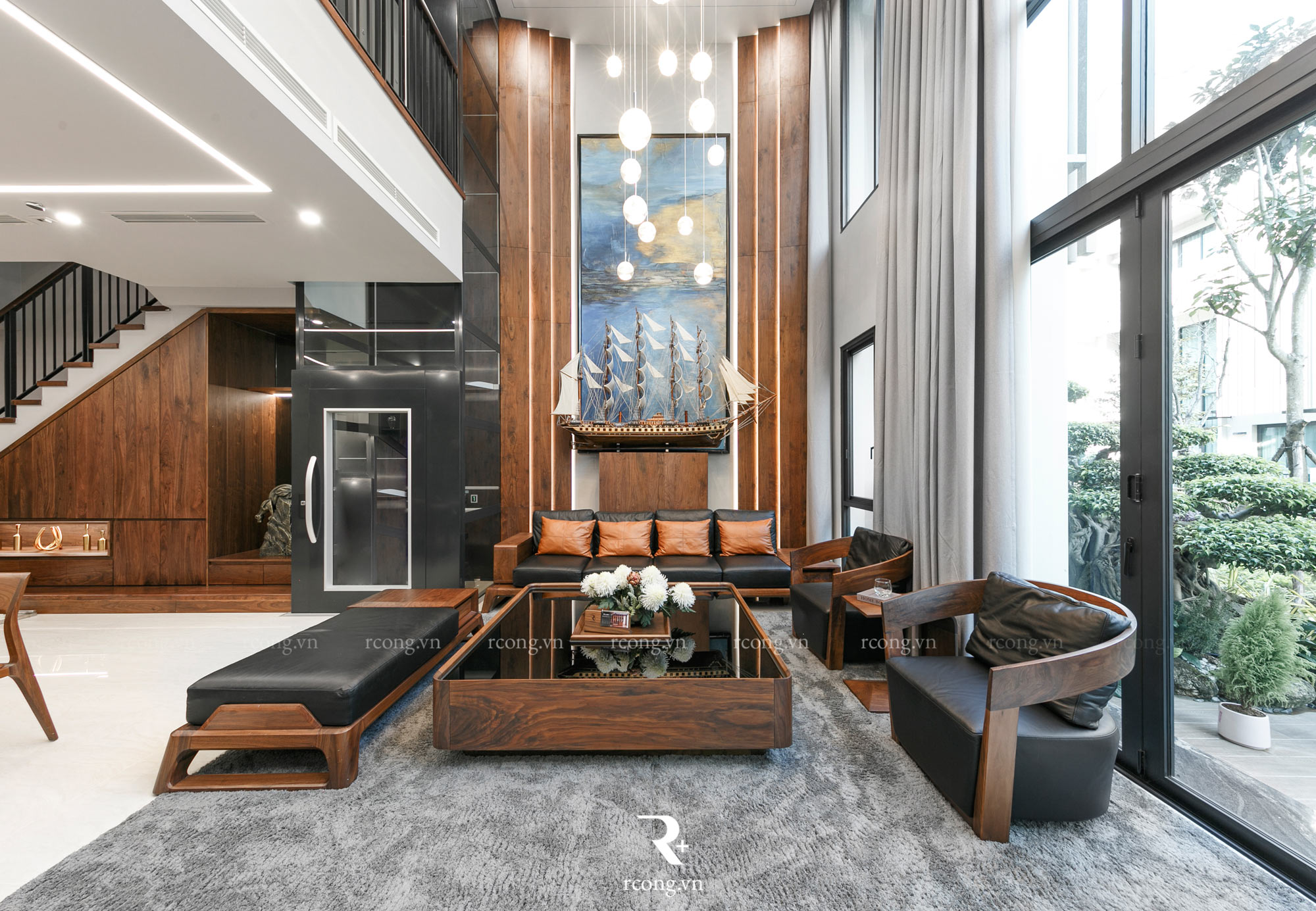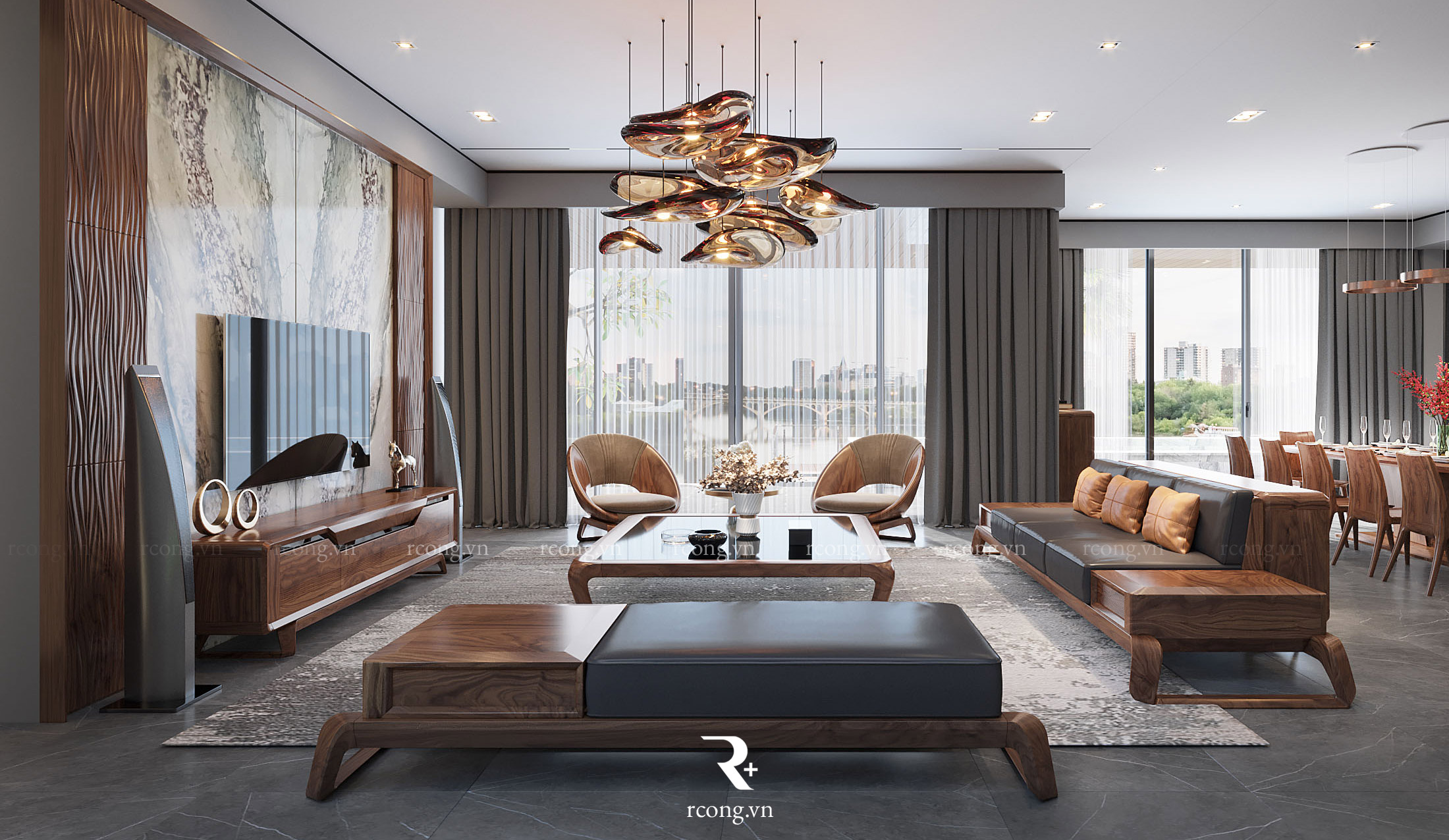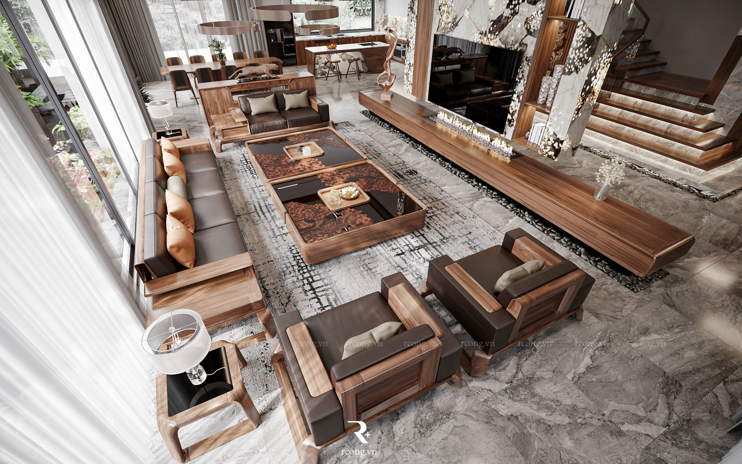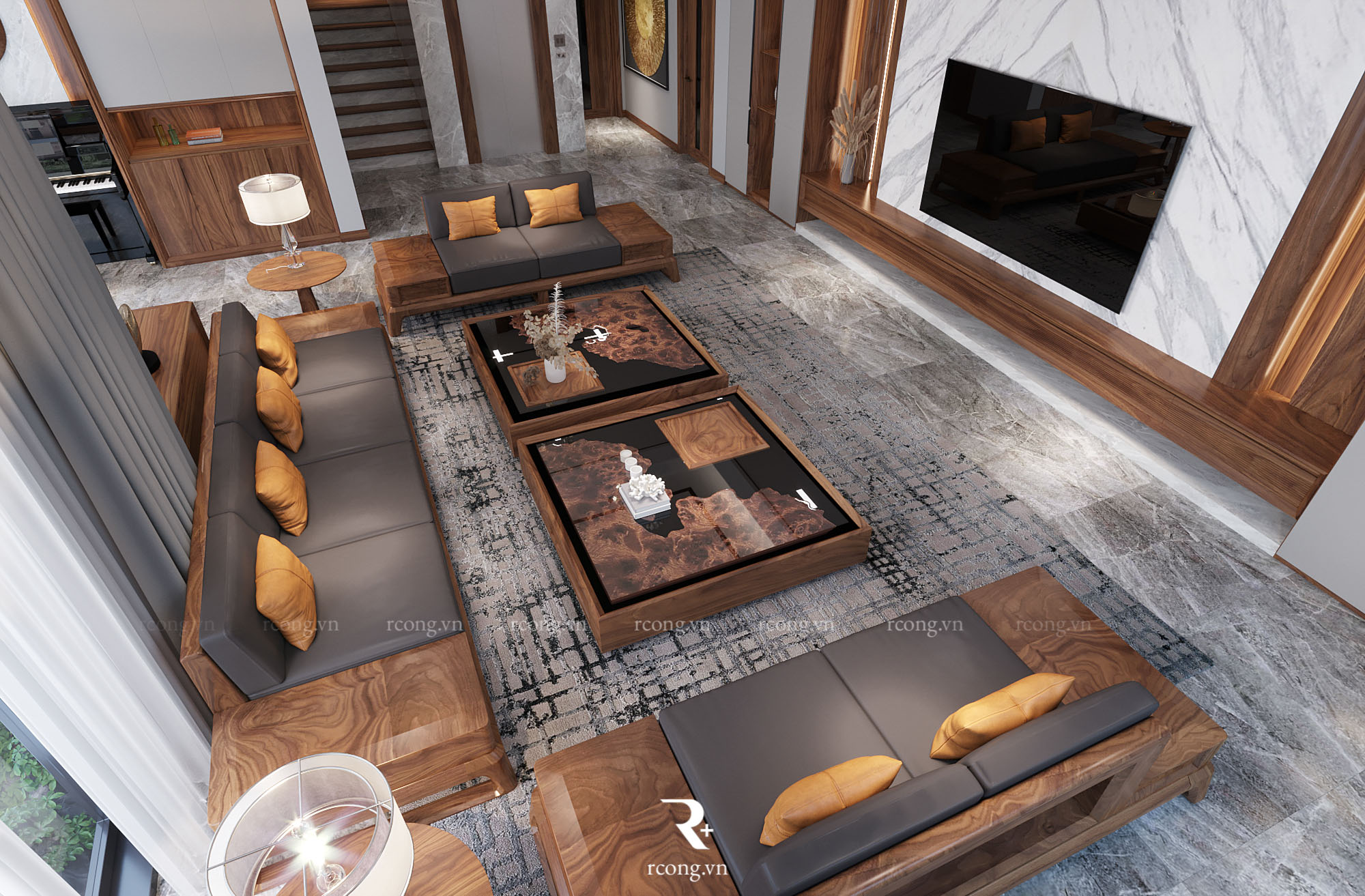 Thiết kế phòng khách gỗ óc chó tự nhiên độc đáo và sang trọng 2022